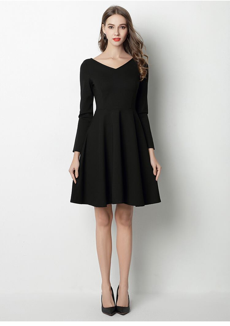 レディース/ワンピース/ひざ丈/ミドル丈/2ピース風/フレアスカート/長袖/Vネック/フォーマル/ブラック/シンプル/セクシー/おとなかわいい/OL/デート/オフィス/通勤/秋冬/ワンピ/フェミニン/タイト