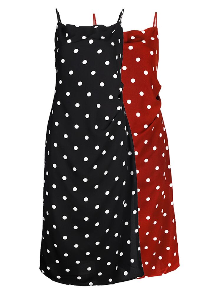 ドット柄膝丈スリットキャミソールワンピース 新作 夏 レッド ブラック Vネック セクシー 水玉 ミディアム cnalbi043005