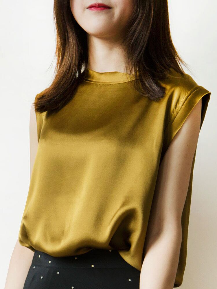 レディース ノースリーブ サテン シルク メタリック 緩い ラウンドネック 10色 シック 大人っぽい シンプル ベーシック cnalbn0250