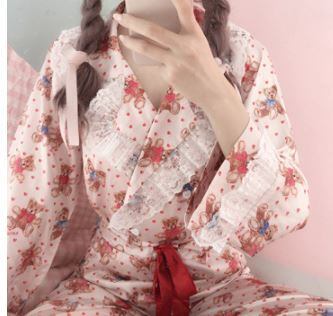 パジャマセット くま ピンク 光沢感 レース ロリータ風 かわいい キュート 2点セット ルームウェア 部屋着 上下セット 大きいサイズ サイズ豊富 ガーリー 秋冬 お泊り パジャマパーティ レディースファッション cnalby0439