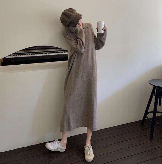 ニットワンピース/ワンピース/フレアワンピース/2色/ニット/Aラインワンピ/ロング丈//マキシ丈/長袖/Xライン/ゆったり/Vネック/襟付き/フレア袖/フレアスリーブ/無地/レトロ/ベーシック/トレンド/シンプル/ナチュラル/ラフ/ヘルシー/おしゃれ/こなれ感/上品/落ち着いた/きれいめ/キレイ目/フェミニン/ガーリー/ゆるふわ/秋/秋物/秋服/普段着/お出かけ/デート/合コン/女子会/ベイクドカラー/くすみカラー/20代/30代/40代/50代/60代/レディース/女子ウケ/甘辛コーデ/甘辛MIX/動きやすい/楽/楽ちんコーデ/着回し/ヘビロテ/合わせやすい