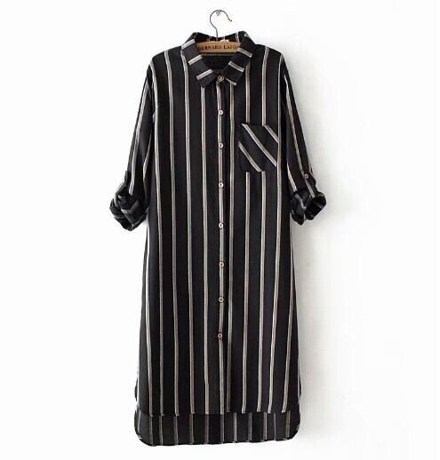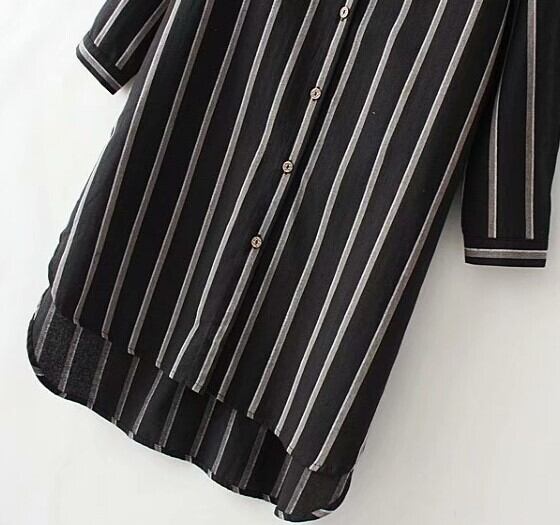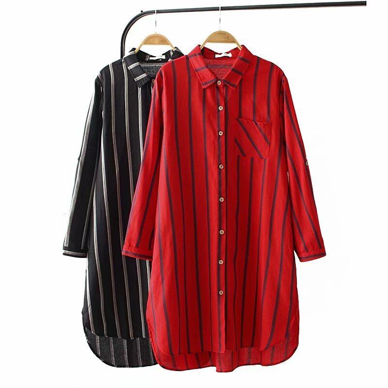 チュニック/シャツ/ロングシャツ/2色/長袖/ストライプ/ボーダー/襟付き/Vネック/レトロ/レイヤード/ベーシック/ゆったり/体型カバー/ラフ/カジュアル/ヘルシー/こなれ感/シック/大人っぽい/きれいめ/キレイ目/秋/秋物/秋服/普段着/お出かけ/散歩/休日/20代/30代/40代/50代/60代/レディース/カジュアルダウン/快適