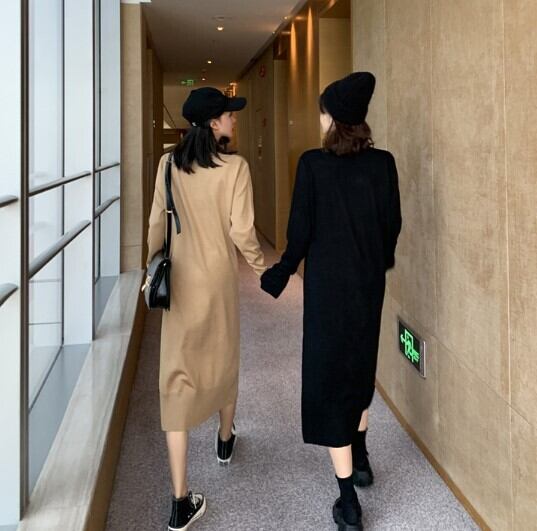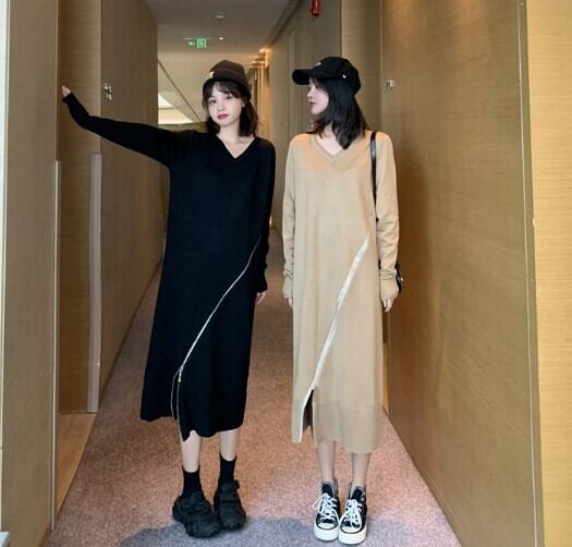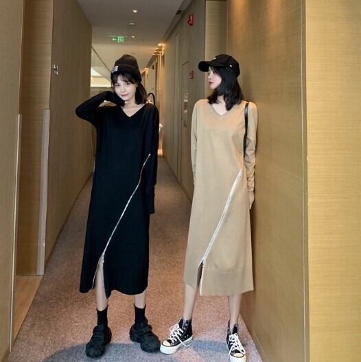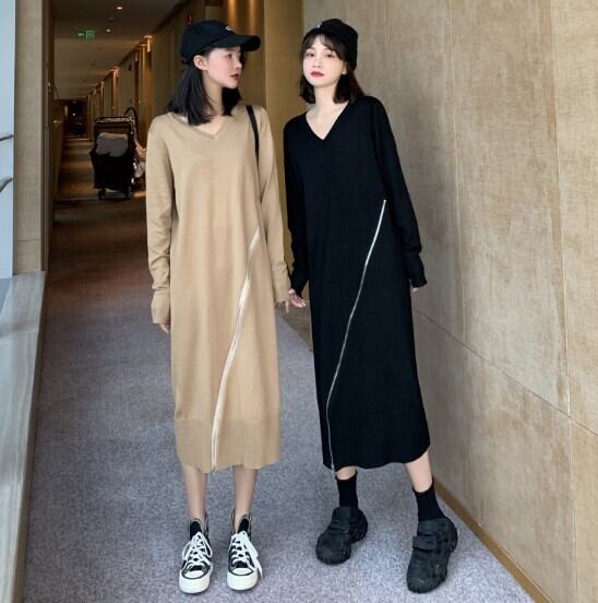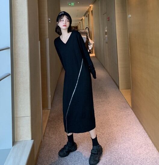 ニットワンピース/ワンピース/Aラインワンピ/ひざ下丈/ミモレ丈/長袖/Iライン/ゆったり/体型カバー/Vネック/ジッパー/無地/レトロ/レイヤード/ベーシック/トレンド/スリット/シンプル/ナチュラル/ラフ/カジュアル/ストリート/ヘルシー/おしゃれ/こなれ感/かわいい/可愛い/きれいめ/キレイ目/フェミニン/ゆったり/秋/秋物/秋服/普段着/お呼ばれ/お出かけ/通勤/オフィス/デート/合コン/女子会/20代/30代/40代/50代/60代/レディース/甘辛コーデ/甘辛MIX/楽/楽ちんコーデ/着回し/ヘビロテ/合わせやすい