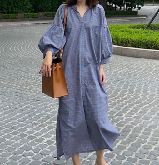 チェックワンピース2色 ロング スリット ゆったり オーバーサイズ リネン混紡 コットン混紡 長袖 パフスリーブ 春物 かわいい ふんわり レイヤード 10代 20代 30代 40代 レディースファッション cnalby1338
