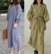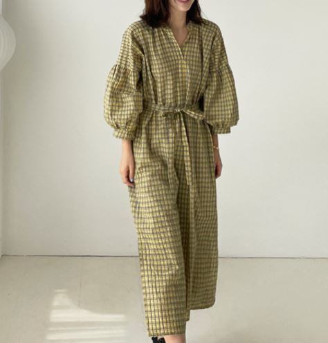 レディースファッション/ワンピース/ワンピ/長袖/パフスリーブ/チェック/オーバーサイズ/リネン混紡/コットン混紡/ノーカラー/スキッパー/ゆったり/サイドスリット/レイヤード/重ね着/ロング/おしゃれ/カジュアル/ガーリー/デイリー/おでかけ/大人/モダン/無地/シンプル/着回し/ゆったり/ラフ/体型カバー/おしゃれ/大人/かっこいい/クール/10代/20代/30代/40代/50代