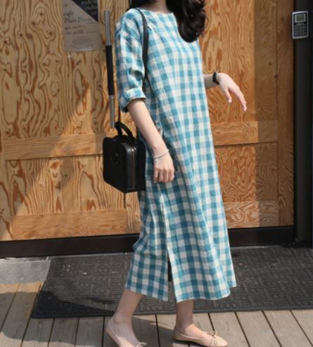 リネン混ワンピース3色 春物 春秋 長袖 ロング マキシ ゆったり ノーカラー チェック 大人 かわいい おしゃれ 体型カバー デイリー 普段使い おでかけ 上品 クルーネック 10代 20代 30代 40代 レディースファッション cnalby1387