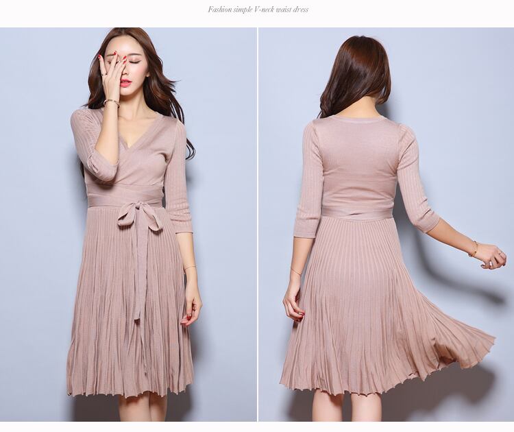 即納あり 大人可愛く決まる!カシュクールのニットワンピ Vネック 長袖 リボン 膝下ワンピース Aラインcnalb0647
