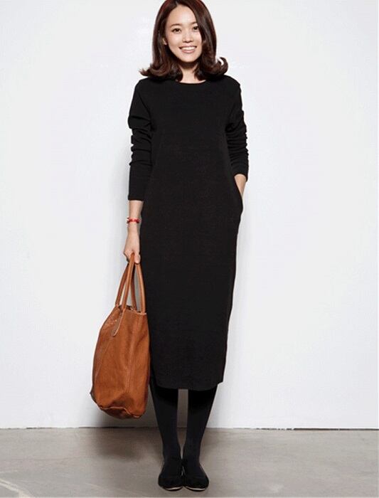ワンピース/長袖ワンピース/細身/ロング丈/無地/シンプル/裏起毛/ビッグサイズ